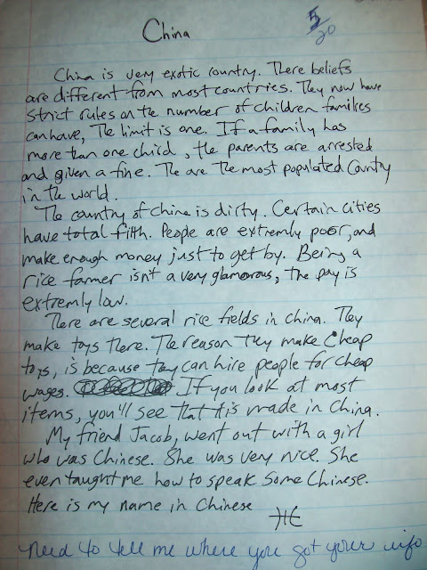 Recently we unearthed an old essay written by the one and only Neil Coulter circa 1995. We're talking about senior year of high school Neil Coulter. It would be fair to say that 1995 Neil was suffering from a bad case of senioritis and operating under a heavy dose of teen angst. It would also be safe to assume that he wrote the glorious geographical analysis of China, pictured below, in under five minutes. I would guess he started and finished this assignment during the five minute passing period between classes. How would I know such a thing? Well, I teach high school kids. And even if I've never assigned an essay about China, I have, in fact, read this sort of essay many, many times before. And I know the type of kid who writes this sort of drivel; He's the kid who cares about his grade just enough to turn something in, but pays no regard to the quality of his work. It's the type of essay that has hand-writing that gets progressively worse as time runs short. It has no beginning, no ending, and no real facts or support; it's a filled up sheet of paper and a hopeful attempt at squeezing out a couple of measly assignment points. As a seasoned veteran, I'm never shocked when I receive an essay of such poor quality. What I will forever be surprised about, though, is that I ended up happily married to one of "those kids." Before I get too far into this, let's all take a moment to bask in the glory that is "CHINA" by Neil Coulter: